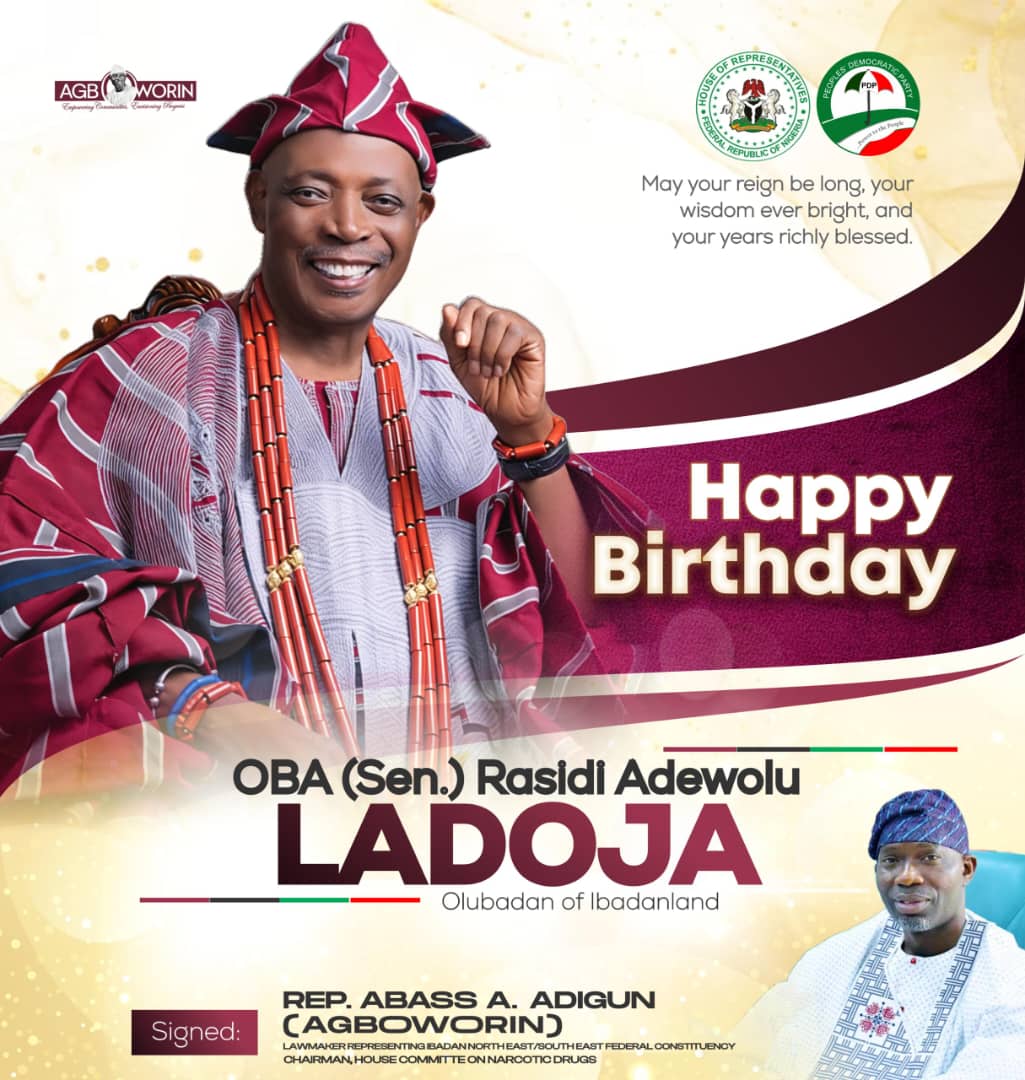 The lawmaker representing Ibadan North East/South East Federal Constituency, Rep. Abass Adigun (Agboworin), has extended warm felicitations to the Olubadan of Ibadanland, Oba Rashidi Ladoja, on the occasion of his 81st birthday anniversary today.