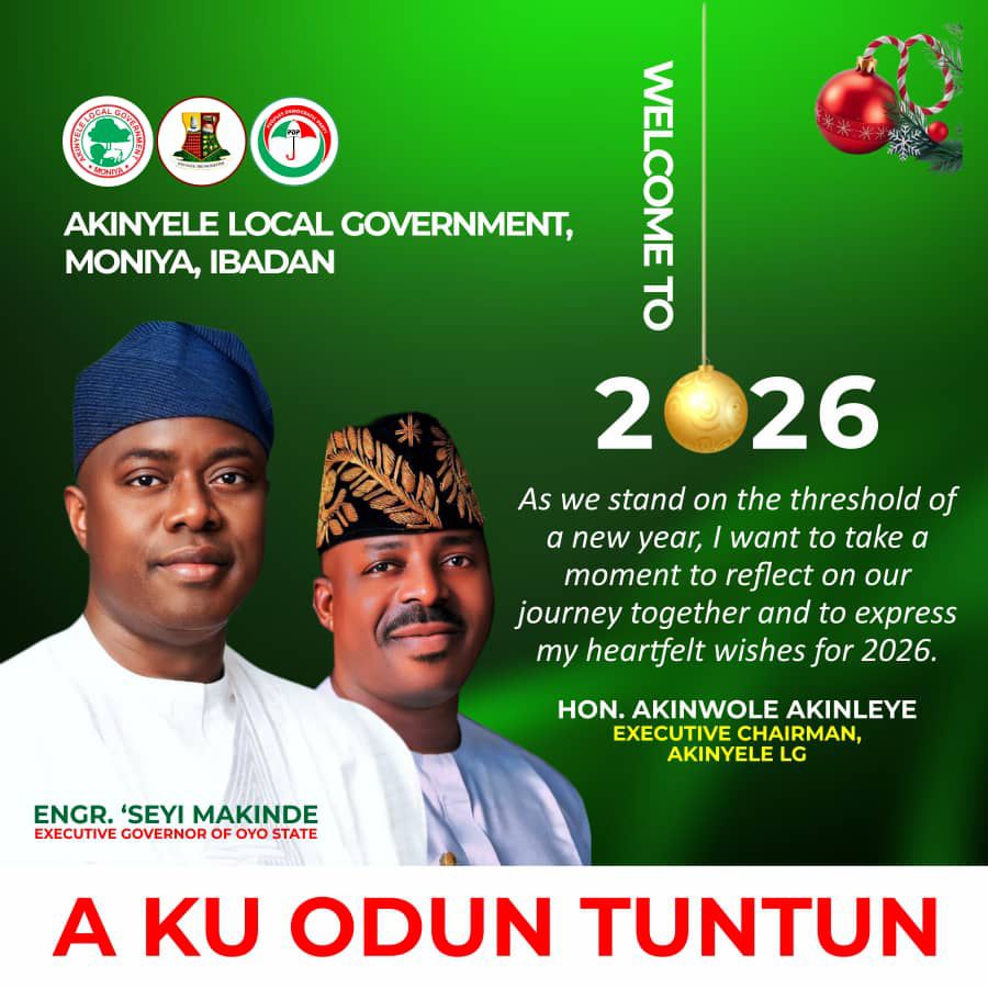 The Executive Chairman of Akinyele Local Government, Hon. Akinwole Akinleye, has extended heartfelt congratulations to the good people of Akinyele Local Government on the occasion of the New Year 2026, praying that Almighty God makes the year a prosperous, fulfilling and rewarding one for all.