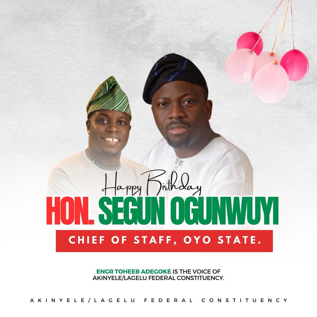 Engr. Toheeb Adegoke has extended warm birthday wishes to Hon. Segun Ogunwuyi, the Chief of Staff to the Governor of Oyo State, describing him as a dependable administrator and a key pillar in the effective delivery of governance in the state.