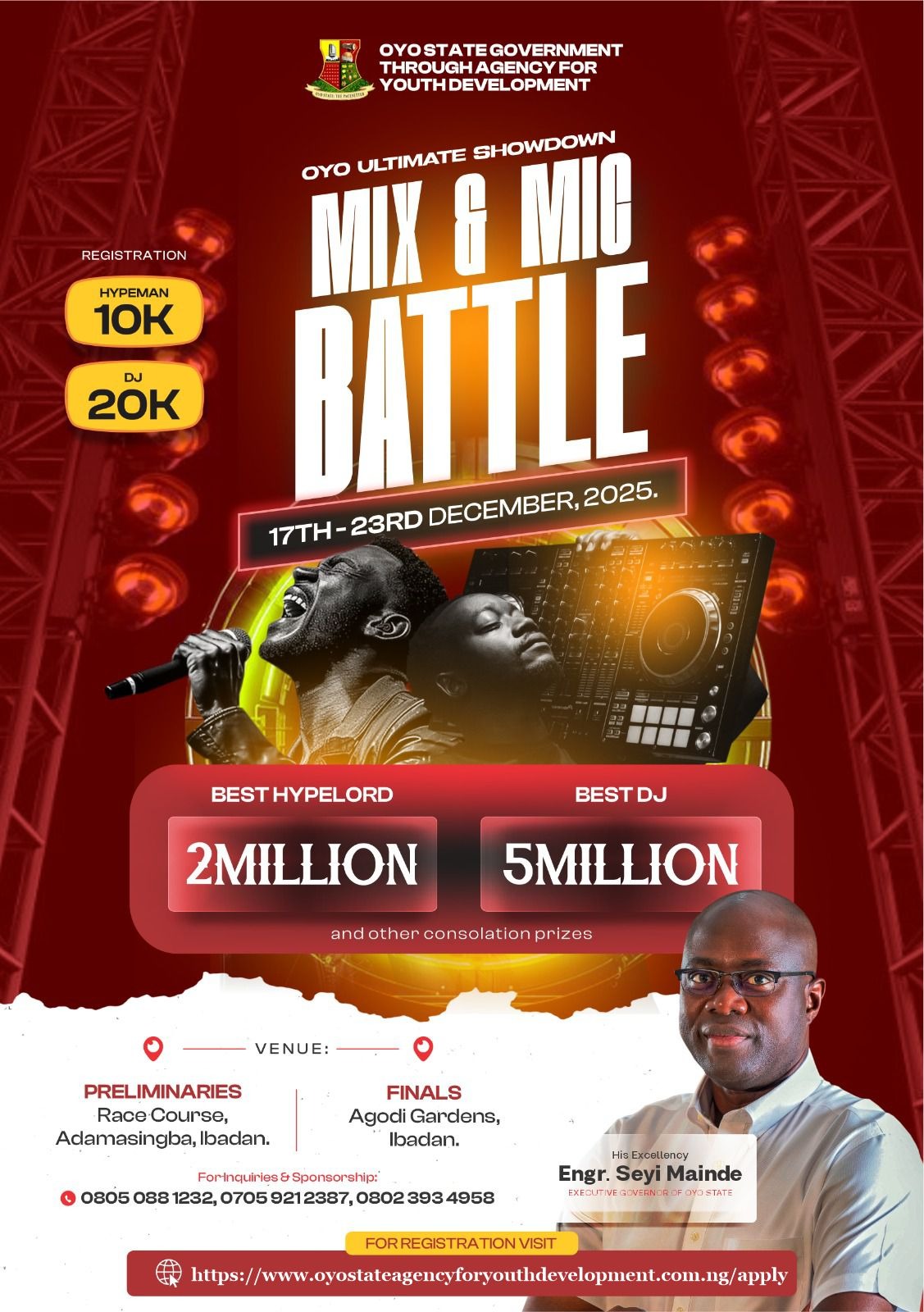 The Oyo State Government, through the Agency for Youth Development, has officially opened the registration portal for the maiden edition of the Oyo Ultimate Showdown: Mix & Mic Battle, marking the commencement of entry submissions for one of the state’s most ambitious entertainment initiatives.