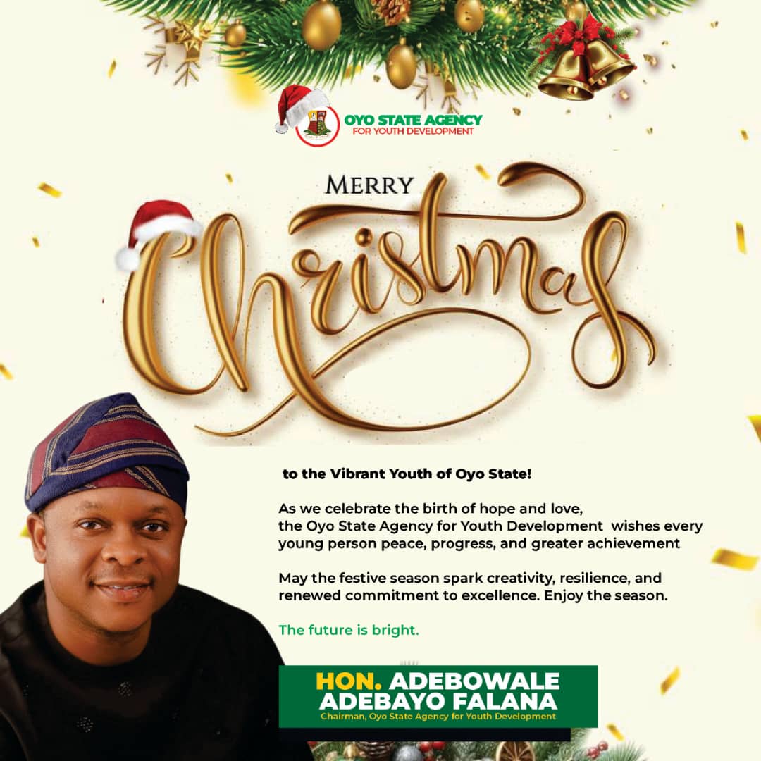 The Oyo State Agency for Youth Development (AYD) under the visionary leadership of Hon. Adebowale Adebayo Falana, has extended warm Christmas greetings to youths across the state, urging them to embrace the spirit of love, unity, and renewed hope that the season represents.