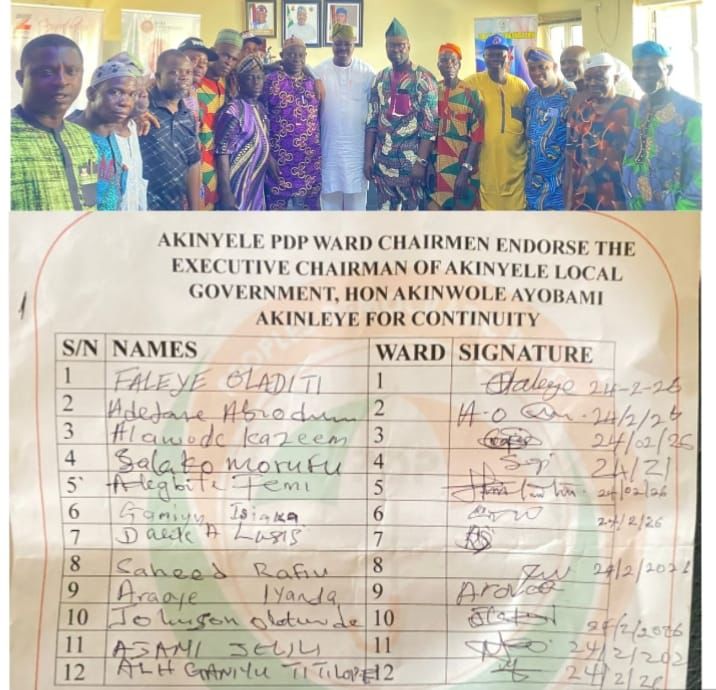 In a strong show of unity and satisfaction with purposeful leadership, the Twelve (12) Ward Chairmen of the Peoples Democratic Party (PDP) in Akinyele Local Government have collectively acknowledged the remarkable developmental strides of the Executive Chairman, Hon Akinwole Akinleye, and officially endorsed him for continuity in office.