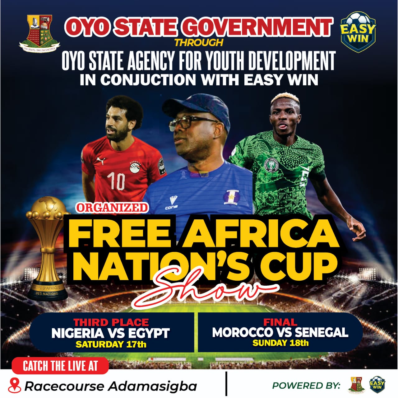 The Oyo State Government through the State Agency for Youth Development has announced the continuation of its free public viewing initiative for the 2025 Africa Cup of Nations (AFCON), extending the programme to cover the third-place match between Egypt vs Nigeria on Saturday and the grand finale, Senegal vs Morocco scheduled for Sunday.