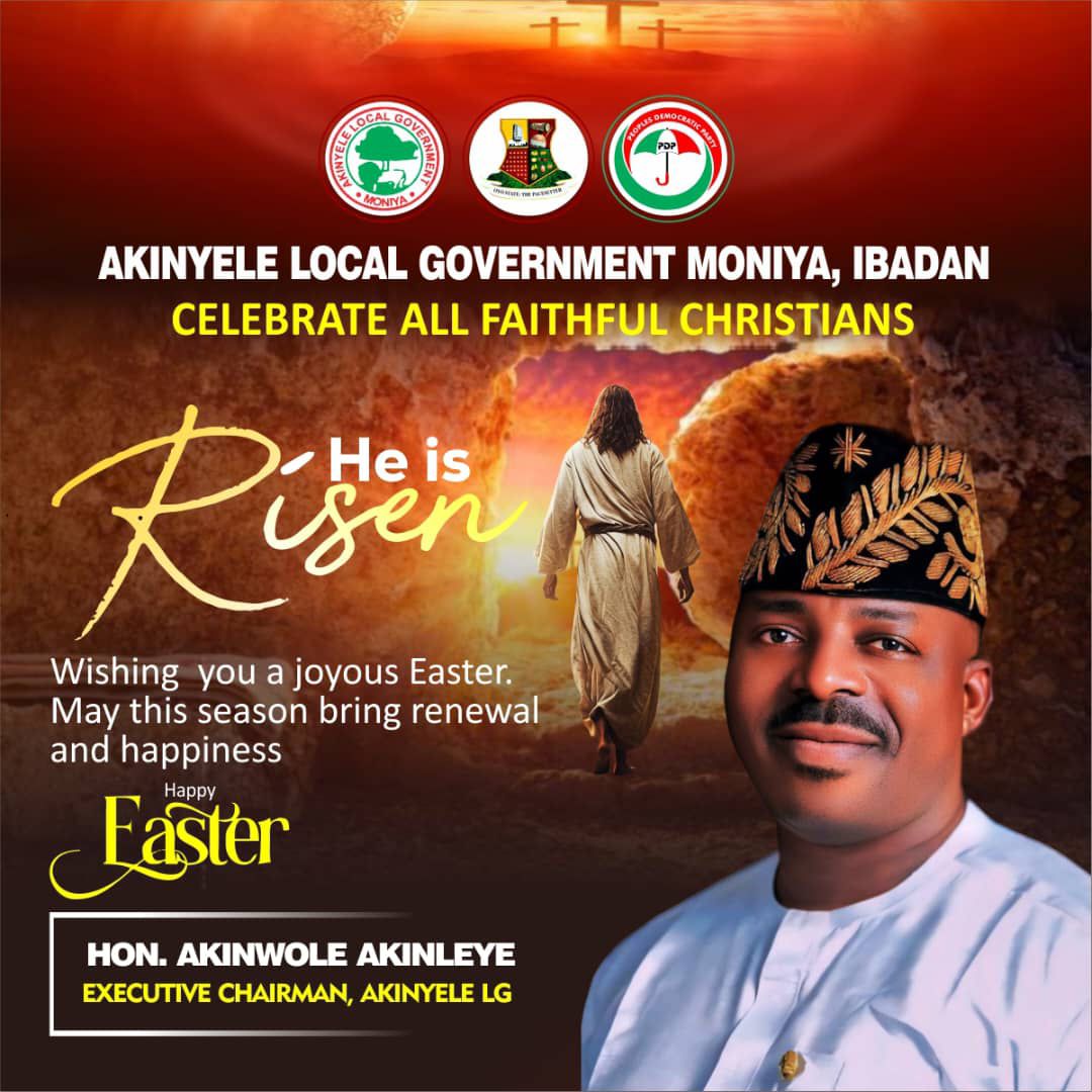 The Executive Chairman of Akinyele Local Government, Hon. Akinwole Akinleye, has extended warm Easter greetings to Christians and all residents of Akinyele, urging them to reflect on the significance of the season and embrace the enduring values of unity, love, and togetherness.