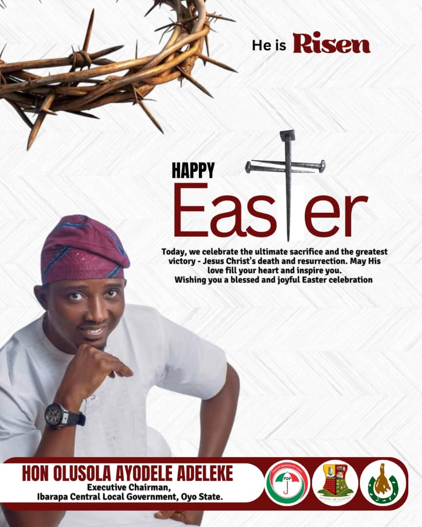 In a heartfelt message, the Executive Chairman of Ibarapa Central Local Government, Hon. Olusola Adeleke, described Easter as a sacred moment for reflection, renewal and deep appreciation of the boundless love of God demonstrated through the resurrection of Jesus Christ.