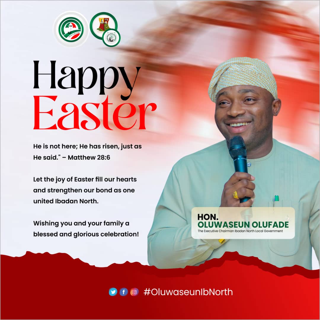 The Executive Chairman of Ibadan North Local Government, Hon. Oluwaseun Olufade, has extended warm Easter greetings to the people of Ibadan North, Oyo State, and Nigeria at large, urging citizens to embrace the message of hope, unity, and love that the season represents.