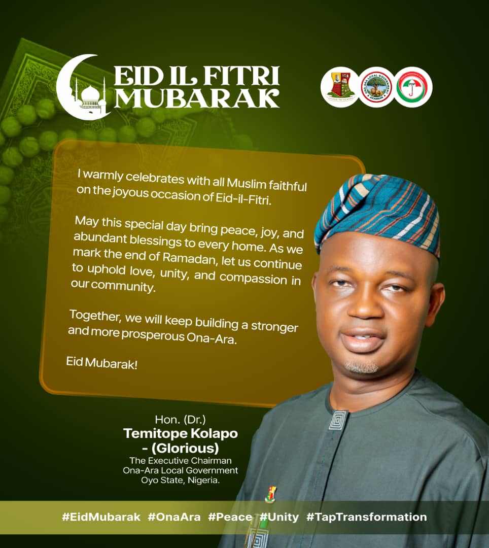 The Executive Chairman of Ona Ara Local Government, Dr. Temitope Kolapo GLORIOUS, has extended warm felicitations to Muslim faithful in Ona Ara, Oyo State, and across Nigeria on the occasion of Eid al-Fitr.