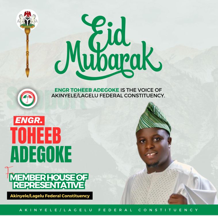 As we celebrate the joyous occasion of Eid El Fitr, I, Engr. Toheeb Adegoke Adlat, extend warmest greetings to all Muslims in Akinyele/Lagelu Federal Constituency and across Nigeria. May this blessed day bring peace, happiness, and blessings to you and your loved ones.