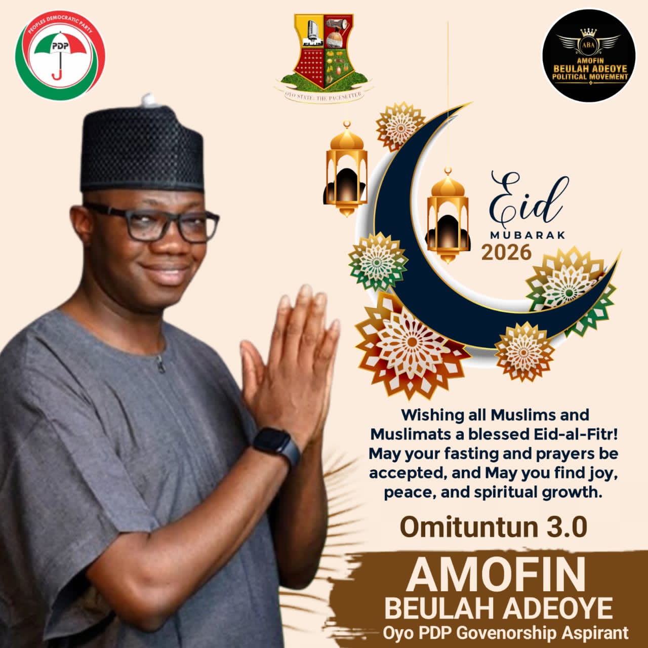 Amofin Beulah Adeoye, president of the Beulah Adeoye Foundation and a leading gubernatorial aspirant under the platform of People’s Democratic Party, Oyo State has extended his warmest greetings and heartfelt congratulations to all Muslim faithful in Oyo State and across the world on the joyous occasion of Eid-il-Fitr.