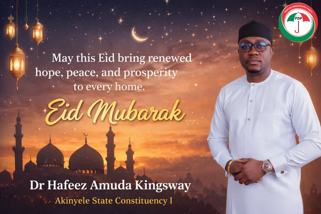 A leading aspirant for Akinyele State Constituency I, Hon. Hafeez Amuda Kingsway, has extended warm greetings to Muslim faithful in his constituency and across Oyo State on the occasion of Eid-el-Fitri, marking the successful completion of the Ramadan fast.