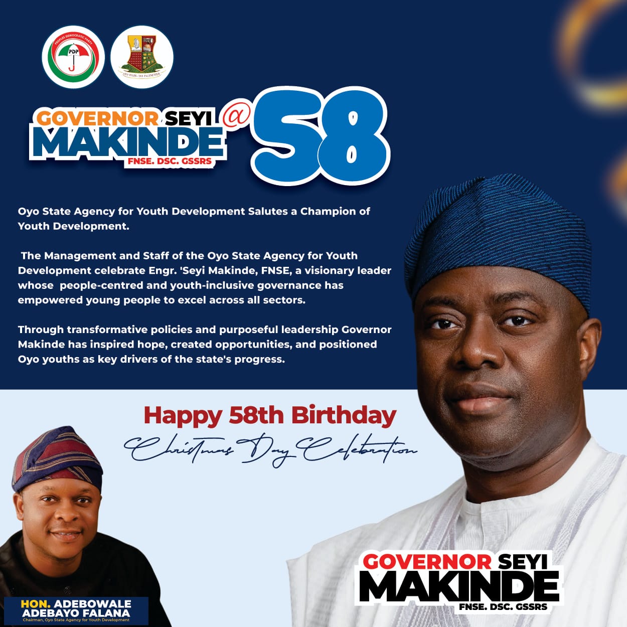 As Governor Makinde marks his 58th birthday, the Oyo State Agency for Youth Development wishes him continued good health, wisdom, and renewed strength to sustain his developmental strides and deepen youth-focused initiatives for the greater good of the state.