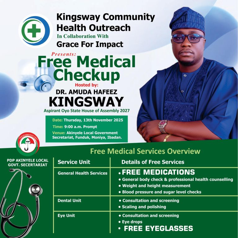 IBADAN – IN a renewed effort to promote community health and improve access to quality medical care at the grassroots, Dr. Amuda Hafeez Kingsway, a 2027 Oyo State House of Assembly aspirant, is set to host a free comprehensive medical outreach for residents of Akinyele Local Government Area, Ibadan.