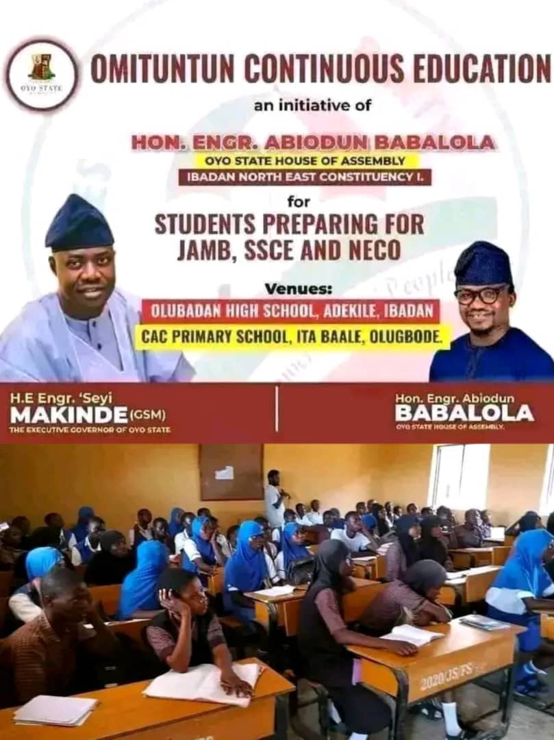 In a continued bid to promote academic excellence and support young learners within his constituency and beyond , Hon. Engr. Abiodun Babalola Ph.D., the lawmaker representing Ibadan North East Constituency 1, has officially rolled out the Omituntun Continuous Education Program for secondary school students.