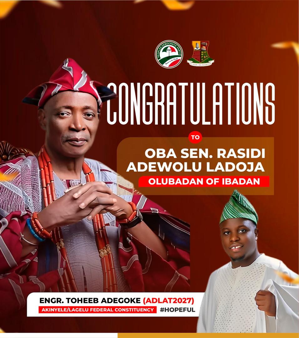It is with immense pride and profound admiration that I, Honorable Engineer Toheeb Adegoke Adlat, aspirant for Akinyele/Lagelu Federal Constituency, extend my warmest congratulations to His Imperial Majesty, Oba Rasheed Adewolu Ladoja, on his exalted coronation as the 44th Olubadan of Ibadanland.