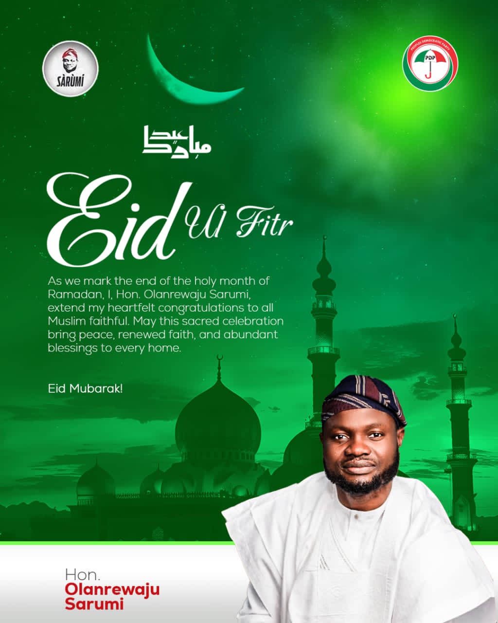 Honourable Lanre Sarumi, popularly known as Skido, has extended his warm congratulations to the Muslim faithful in Ibadan North Local Government and across Oyo State as they celebrate Eid al-Fitr, marking the successful completion of the holy month of Ramadan.