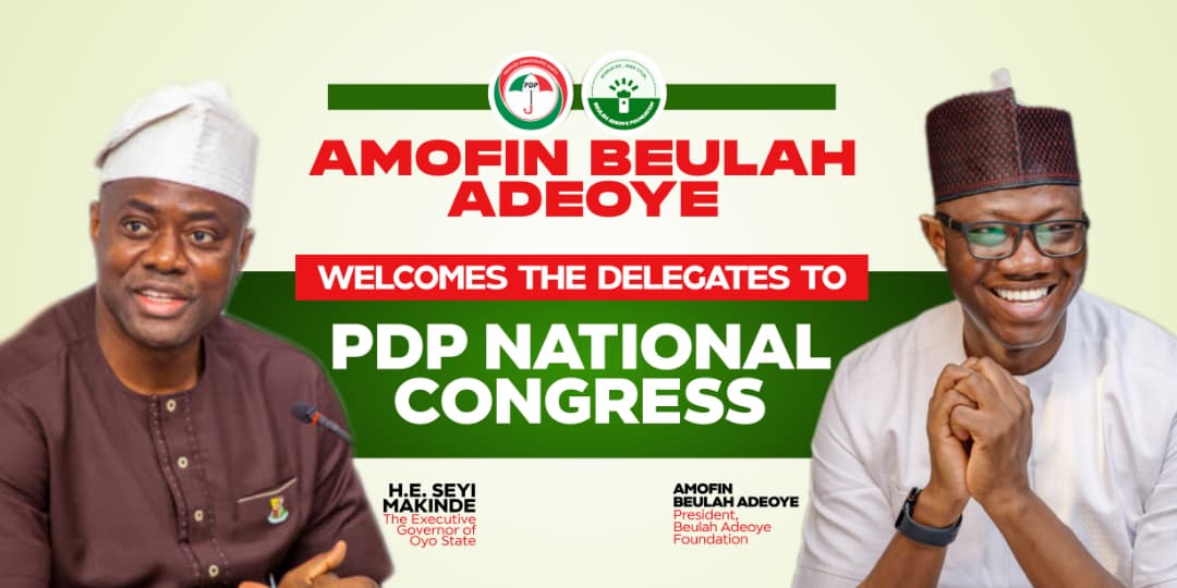 Amofin Beulah Adeoye, founder of the Beulah Adeoye Foundation, has welcomed distinguished delegates, party leaders, and cherished members of the People’s Democratic Party, PDP to the historic Ibadan 2025 National Convention.