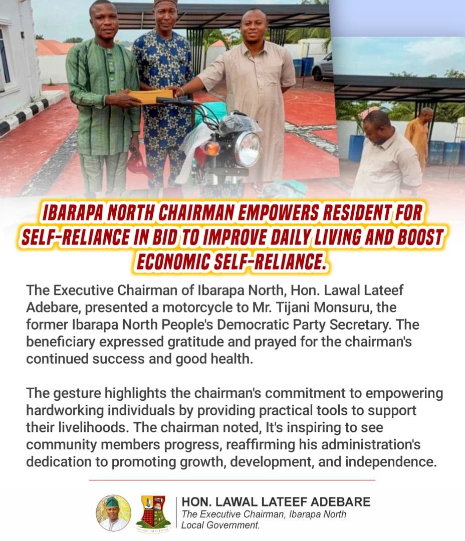 The Executive Chairman of Ibarapa North, Hon. Lawal Lateef Adebare, presented a motorcycle to Mr. Tijani Monsuru, the former Ibarapa North People’s Democratic Party Secretary. The beneficiary expressed gratitude and prayed for the chairman’s continued success and good health.