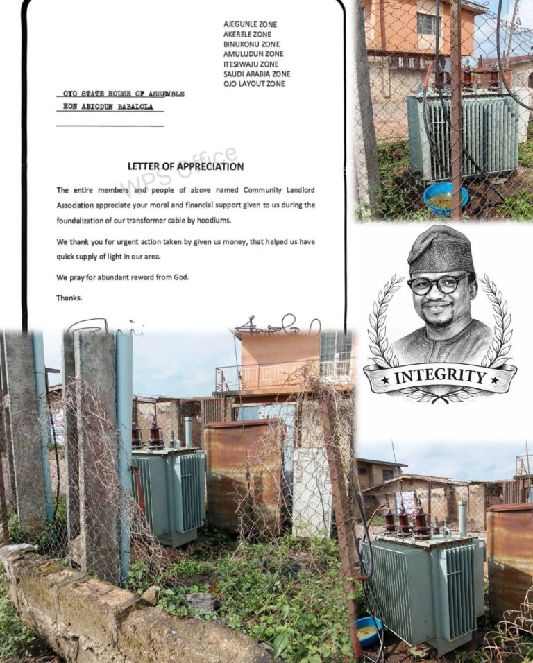 The Isokan Joint Landlords and Landladies Association has expressed its unreserved appreciation to Hon. Dr. Babalola Integrity for his timely financial and moral intervention toward the repair of the electricity transformer serving the Ajegunle, Akerele, Binukonu, Amuludun, Itesiwaju, Saudi Arabia, and Ojo Lane housing zones, which was recently vandalized by hoodlums.
