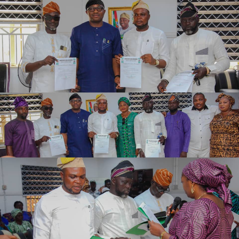 The Executive Chairman of Ibadan North Local Government, Hon. Oluwaseun Olufade, has officially sworn in Mr. Orebinrin Adewumi Ola as Assistant Secretary II, alongside Hon. Olurinde Kabiru (Supervisory Councilor, Ward 1) and Hon. Ayo James (Supervisory Councilor, Ward 12), in a significant ceremony held at the Chairman’s Office in Agodi, Ibadan.