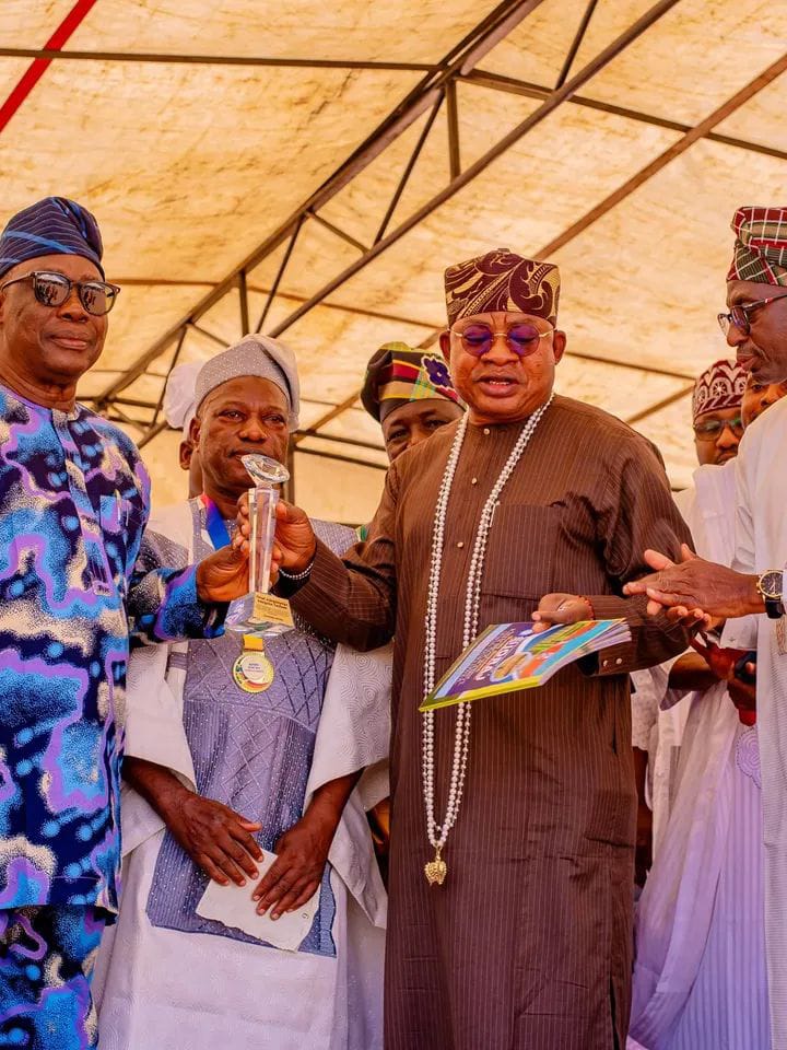 The honour was conferred by the President-General of the Kishi Progressive Union Worldwide (KPUW), Pharm.(Chief) Bioku Rahamon Jimoh BIORAJ, while the commemorative plaque was formally presented by the Deputy Governor of Oyo State and Baamofin of Kishiland, His Excellency Barr (Chief) Adebayo Lawal.