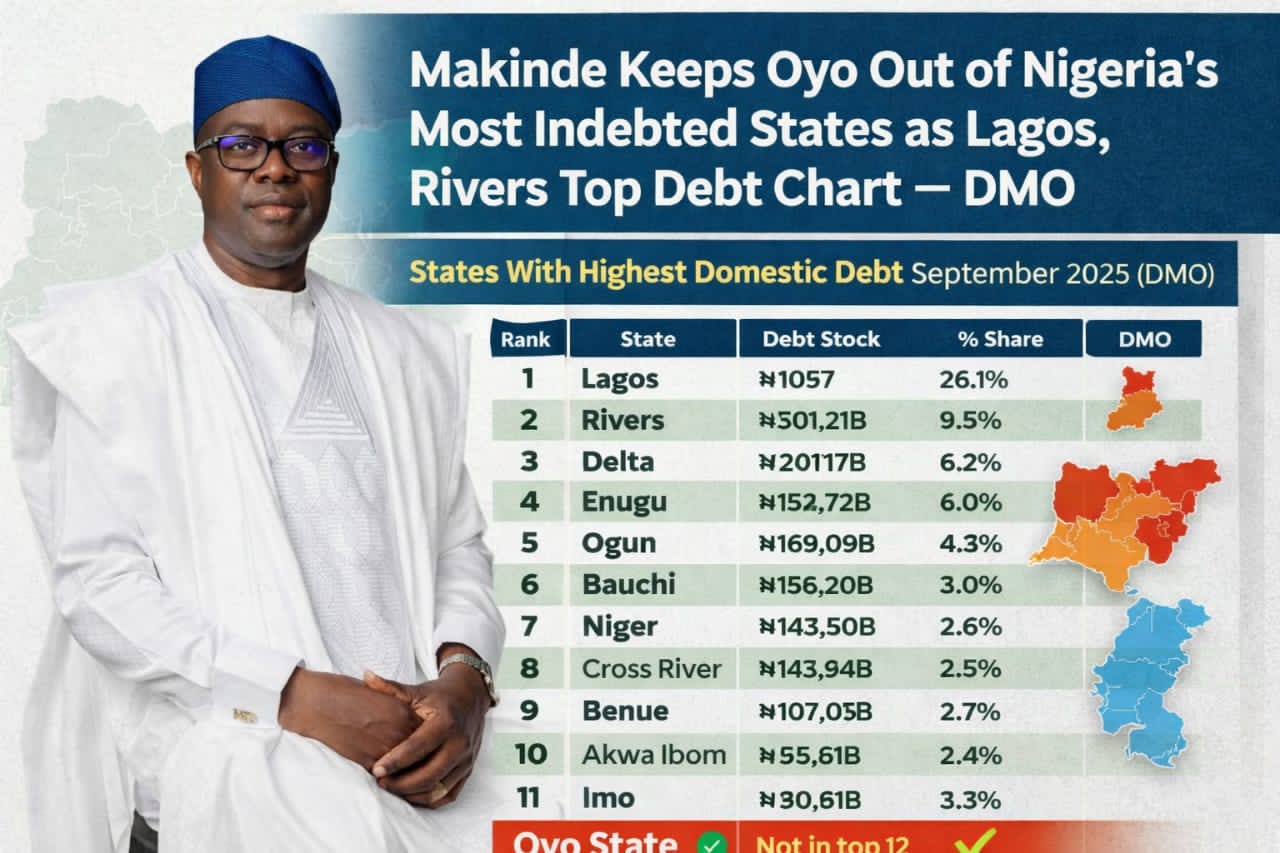 Oyo State did not feature among the 12 states with the highest domestic debt stock as of September 2025, according to new data released by the Debt Management Office, reflecting Governor Seyi Makinde’s position that the state will avoid excessive borrowing.