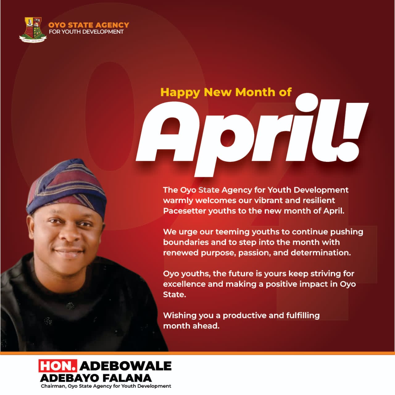 The Oyo State Agency for Youth Development under the chairmanship of Hon. Adebowale Adebayo Falana, has congratulated youths across Oyo State on the commencement of the new month of April, urging them to remain focused and committed to personal growth and societal development.
