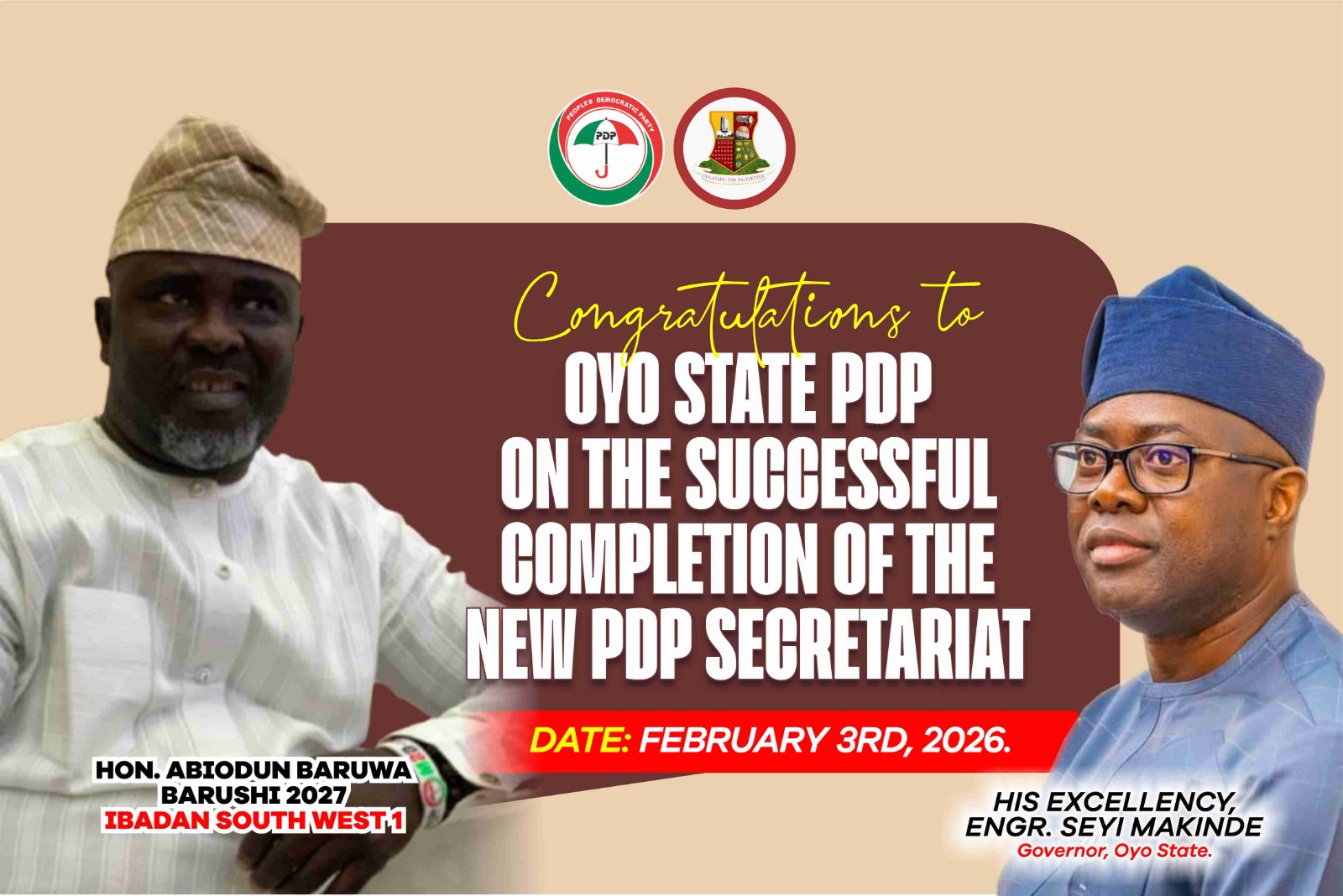 Hon. Baruwa Abiodun Adekunle (Barushi), an aspirant for the Oyo State House of Assembly, Ibadan South West Local Government Constituency I, has commended the Executive Governor of Oyo State, Engr. Seyi Makinde, for the commissioning of the new permanent secretariat of the Peoples Democratic Party (PDP) in the state.