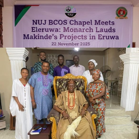 The newly inaugurated leadership of the Nigeria Union of Journalists (NUJ), BCOS Chapel, Oyo State, visited the Eleruwa of Eruwa, HRM Oba Samuel Adebayo Adegbola (Ajobo-Olurin I), on Saturday, 22 November 2025, as part of its ongoing familiarisation tour across the state.