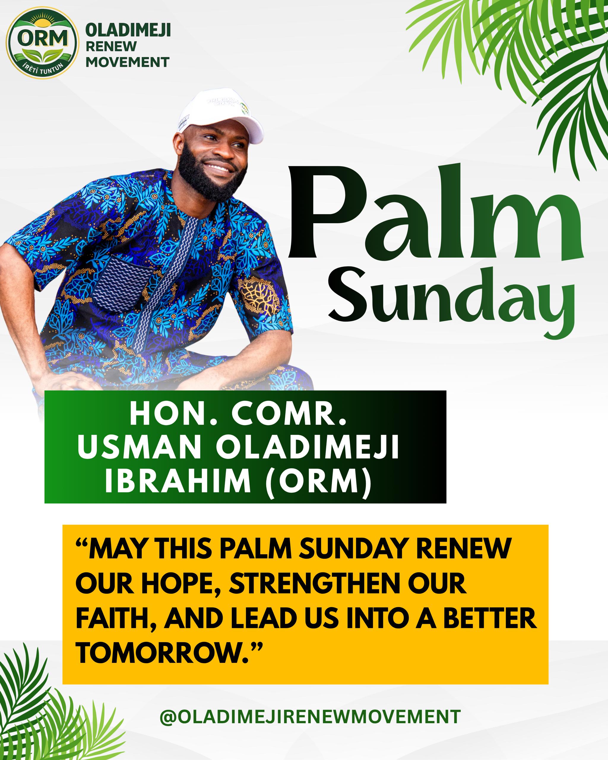 The *Oladimeji Renew Movement (ORM), under the leadership of Hon. Comr. Usman Oladimeji Ibrahim,* warmly celebrates all our Christian brothers and sisters within the movement and across the world on this sacred occasion of *Palm Sunday.*