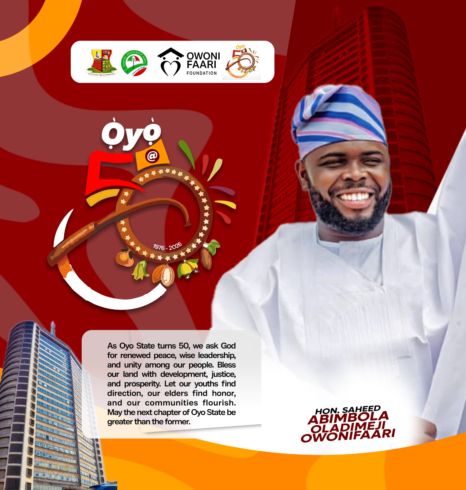 A former aspirant for the House of Assembly in Ibadan South East Constituency 1 under the platform of the People’s Democratic Party, Hon. Saheed Abimbola Oladimeji (Owonifaari) has congratulated the people of Oyo State on the celebration of the Golden jubilee anniversary of the creation of Oyo State, saying the celebration is a moment of pride for all citizens and residents in the state.