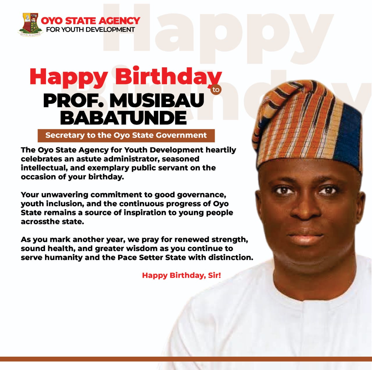 Hon. Adebowale Adebayo Falana, the Chairman of the Oyo State Agency for Youth Development has extended warm felicitations to the Secretary to the Oyo State Government, Prof. Musibau Babatunde Adetunji, on the occasion of his birthday, describing him as an exceptional administrator and a distinguished public servant.