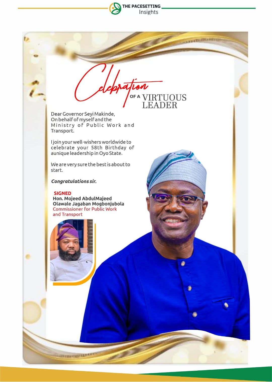 The Oyo State Commissioner for Works, Hon. Mogbonjubola Olawale, popularly known as Jagaban, has extended warm felicitations to the Executive Governor of Oyo State, His Excellency, Engr. Oluseyi Abiodun Makinde, on the occasion of his 58th birthday.