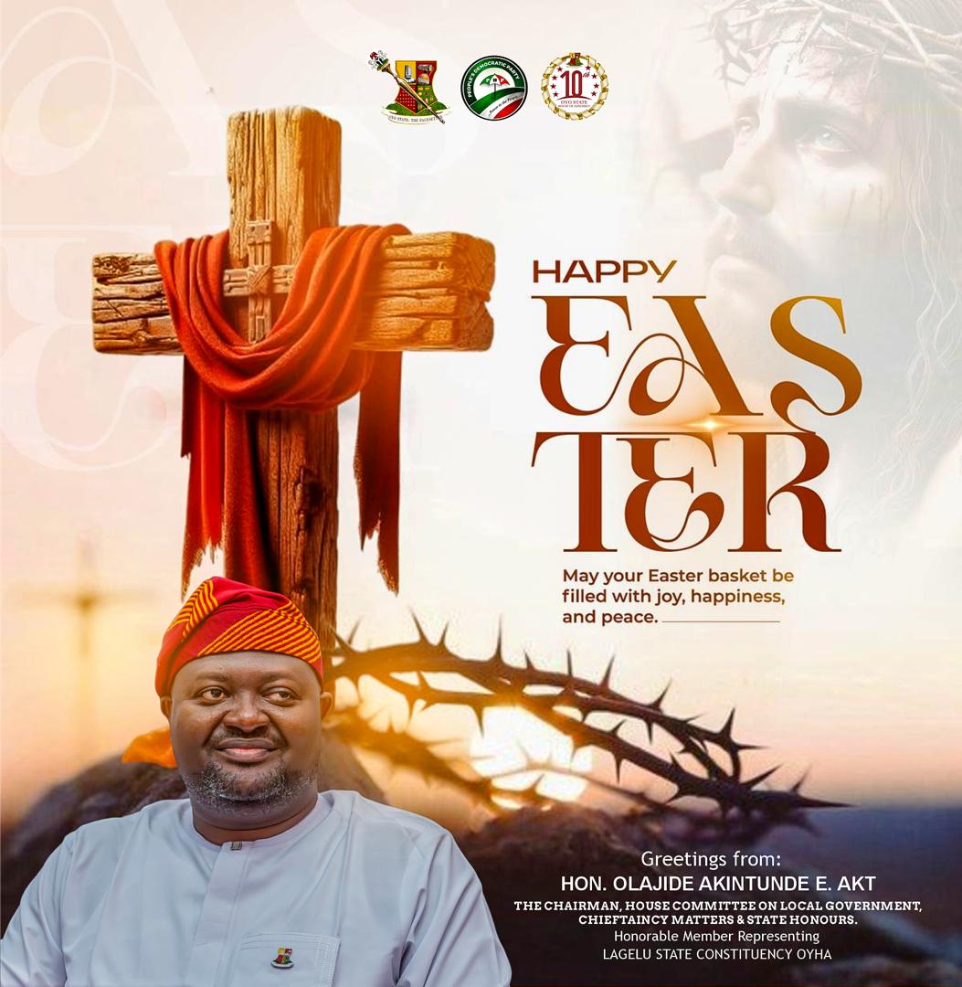 The lawmaker representing Lagelu State Constituency in the Oyo State House of Assembly, Hon. Olajide Akintunde (AKT), has extended warm Easter greetings to Christians across Lagelu Local Government, Oyo State, and beyond, as they celebrate the resurrection of Jesus Christ.