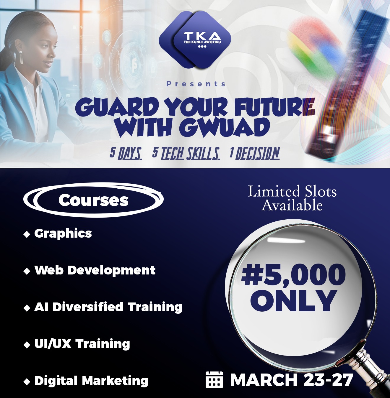 The Kunle Awotiku (TKA) officially presents Guard Your Future With GWUAD, a 5-day intensive workshop designed to train the next generation of tech enthusiasts through hands-on training on industry-relevant skills — all for a token fee of ₦5,000.