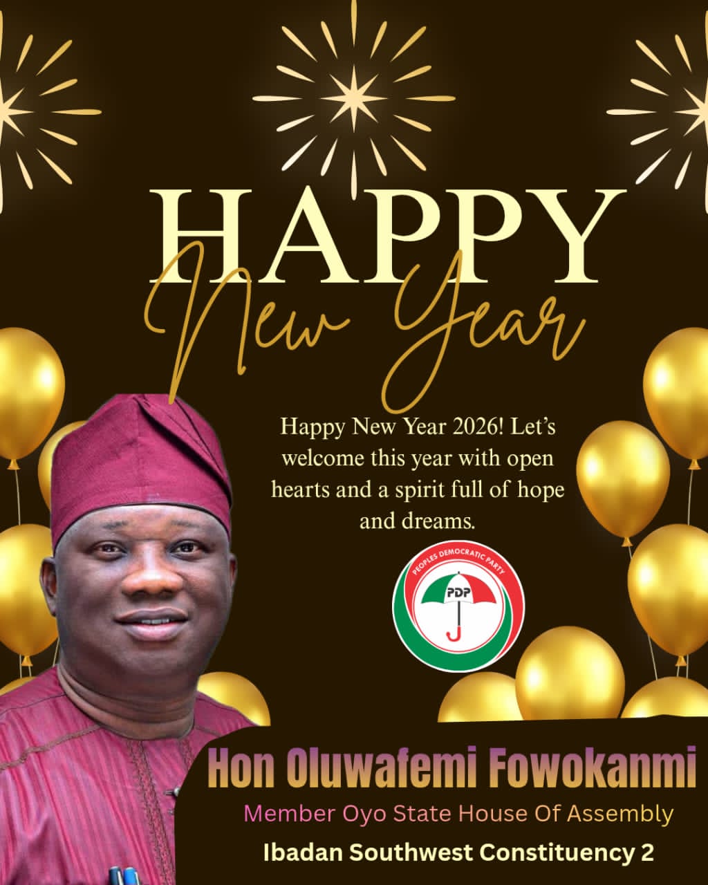 Honourable Oluwafemi Fowokanmi,Oyo Lawmaker representing Ibadan South West Constituency II extends new year goodwill message to the esteemed party leaders, stakeholders, faithful party members, religion leaders and all inhabitants of Ibadan South West local government.In his goodwill message, Fowokanmi re-assures the people that the new year 2026 is filled with greater Increase, multiple blessings, unstoppable promotion, incredible opportunities and a whole lot of good tidings,he encouraged everyone to key into various opportunities imbedded in the new year leveraging on acquired skill,resilience,hard work,co-habiting,team work spirit,showcasing good human relationahip and adequate networking system,noting that every opportunity requires prompt actions to attract them.