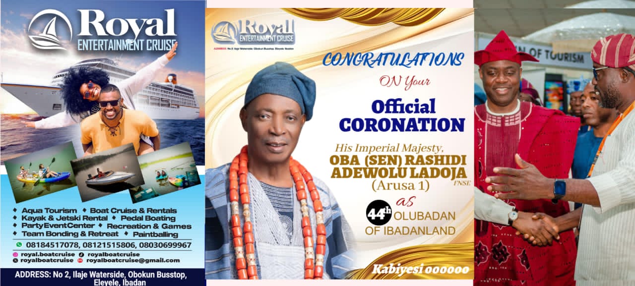 The award-winning tourist delight, Royal Entertainment Cruise, Eleyele Ibadan, owned by aqua-tourism and entertainment investor, Prince (Dr.) Adesanmi Bamidele, has joined well-wishers across the country to celebrate Oba (Senator) Rashidi Adewolu Ladoja FSNE (Arusa I) on his official coronation as the 44th Olubadan of Ibadanland and his 81st birthday celebration.